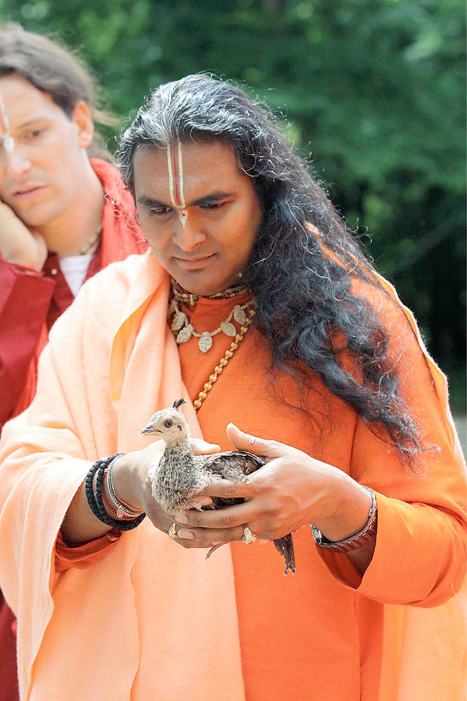 Āšrama ēka, kas atradās gleznainā pakalna nogāzē, atgādināja padomju laiku internātskolu, tikai sakoptāku. Pāvus nevarēja neievērot - tie sēdēja krūmos, klīda pa zemi, izpleta astes vēdeklī un apdullinoši ķērca. Vispārējā mīlestība un apgarotība acīs nekrita. Vestibils bija cilvēku pilns - sievietes ar rūpju māktām sejām slaucīja grīdu ar garo svārku malām, vīrieši apjukuši raudzījās apkārt, bērni raudāja. Visiem uzsmaidīja tikai mūki spilgti oranžos tērpos. Visbiežāk skanēja krievu un ukraiņu valoda, retāk - vācu un franču. Vēl retāk - angļu.