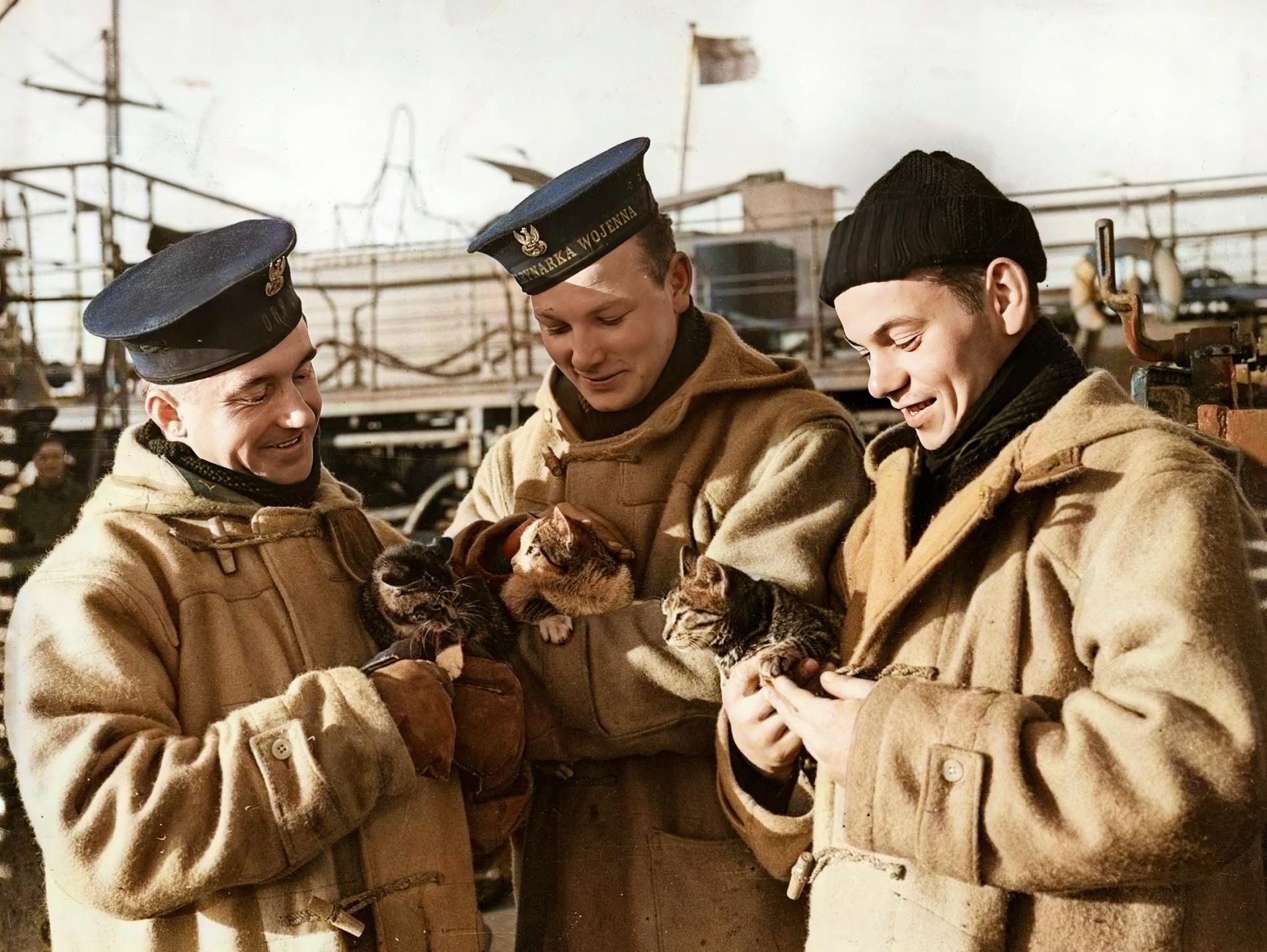 Pirmā un Otrā pasaules kara laikā uz lielākajiem kaujaskuģiem varēja būt pat vairāki kaķi, kas zināmā mērā bija gluži tādi paši kauju dalībnieki kā cilvēki. Īpaši lieli kaķu mīļi izrādījušies britu jūrnieki. Lielā mērā tieši briti un amerikāņi parūpējušies, lai šo dzīvnieku kara stāsti tiktu fiksēti un saglabāti vēsturei. Tā kaķenīte Pūlija, pilnajā vārdā Princese Papūlija, 1944. gadā jau piedzima ASV jūras kara flotes bāzē Pērlhārborā un visus sava mūža 15 gadus nodienēja uz desanta transportkuģa Fremont, piedaloties līdz ar kuģi un tā ļaudīm visās tā laika lielākajās ASV desantoperācijās Klusajā okeānā. Pūlija bija slavena ar to, ka, atskanot trauksmei, vienmēr devās uz kuģa pasta telpu un nogūlās uz pasta somas. 1959. gadā, aizvadot Pūliju «pensijā», jūrnieki kaķim sarūpēja īpašu formastērpu ar uzšuvēm par ilgu dienestu un četrām zvaigznēm par piedalīšanos kaujās.