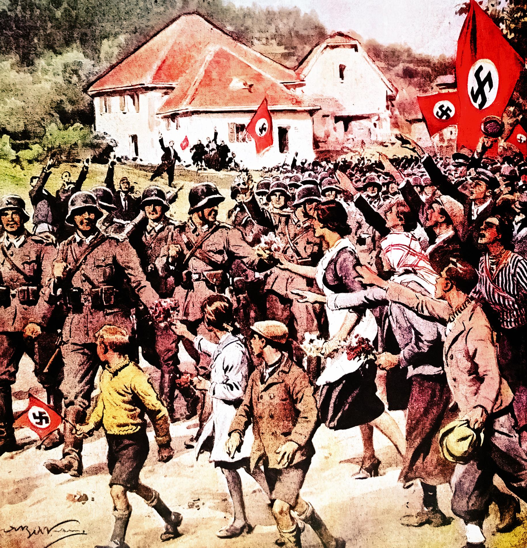 Fīrers savus plānus īpaši neslēpa. Pēc viņa domām, visiem vāciešiem ir jāatgriežas Vācijā, turklāt ne jau tukšām rokām, bet gan kopā ar viņu apdzīvotajām teritorijām, kas Pirmā pasaules kara noslēgumā Vācijai nelietīgi nolaupītas. Par to fīrers pavisam atklāti paziņoja 1938. gada februārī reihstāga sēdē, kur pasludināja, ka gatavojas Vācijai pievienot arī tos desmit miljonus vāciešu, kuri patlaban dzīvo aiz valsts robežām. Kā pirmo dzimtenes apkampienos 1938. gada pavasarī atgrieza Austriju, taču tur situācija bija būtiski atšķirīga: pirmkārt, ļoti liela iedzīvotāju daļa ar abām rokām bija par iekļaušanos vācu reihā; otrkārt, Austrijas valdošie politiķi Hitlera un vietējo nacistu spiediena dēļ tā nopietni pat nesāka domāt par pretošanos. Lielākais, ko mēģināja panākt Austrijas kanclers Kurts Šušnigs - referendumu par pievienošanos Vācijai. To Hitlers Austrijā arī sarīkoja, taču, kā tagad varētu teikt, tādā īsteni putiniskā garā - vispirms ieveda Austrijā armiju, bet pēc mēneša sarīkoja referendumu. Nav brīnums, ka tādos apstākļos 99,7 procenti nobalsoja par Austrijas pievienošanos Vācijai. Tiesa, diezgan droši var apgalvot, ka austriešu vairākums tāpat būtu nobalsojis arī bez Vācijas armijas klātbūtnes, taču diez vai runa vairs būtu par 99 procentiem.