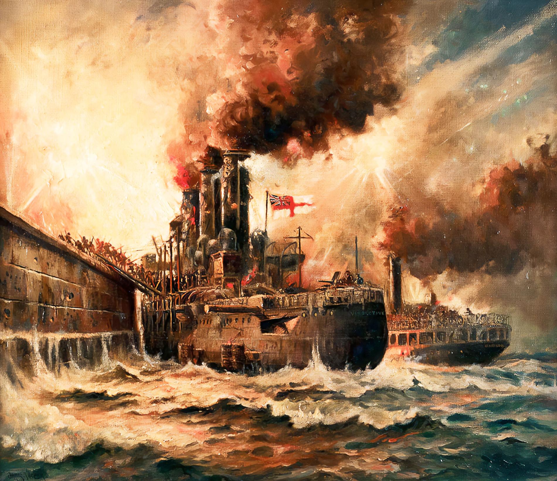 Plkst. 23.30 flote atradās pie Zēbriges vārtiem. Artilērijas apšaudei paredzētie kuģi bija ieņēmuši pozīcijas, torpēdlaivas - izvietojušās rindā, gatavas tos aizklāt ar dūmu aizsegu, iznīcinātājkuģi sedza spēkus pret iespējamo vācu zemūdeņu uzbrukumu, savukārt nedaudz tālāk atradās sedzēji, kas bija gatavi atsist varbūtējo vācu iznīcinātājkuģu uzbrukumu. Sākotnējais dūmu aizsegs bija pietiekami biezs, par spīti vācu ugunij, tomēr plkst. 11.56 mainījās vēja virziens un dūmi sāka plūst prom no mola, atklājot britu kuģus vācu artilērijai.