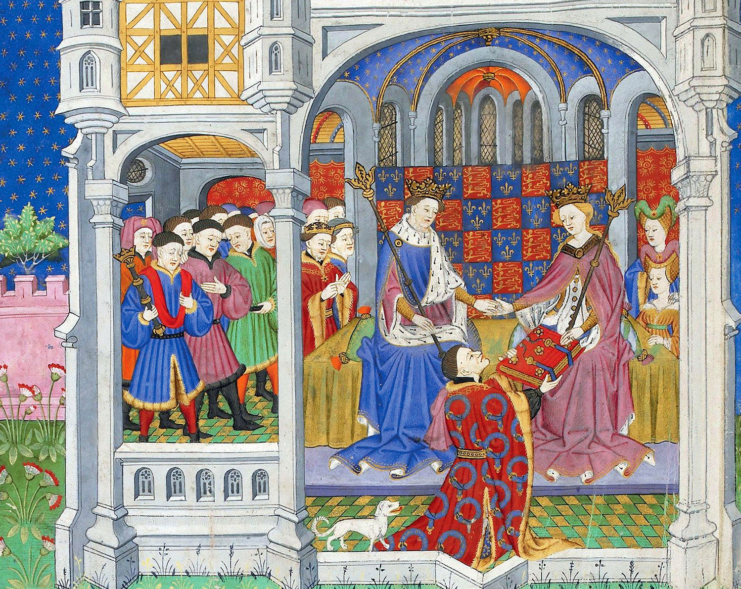 Zemāk: Talbota Šrūsberī grāmata ir iespaidīga izmēra - 47,5×33,5 cm - un bagātīgi ilustrēts manuskripts, kas 1444. gadā tika izgatavots Ruānā un apkopo bruņnieciskumam veltītus tekstus.