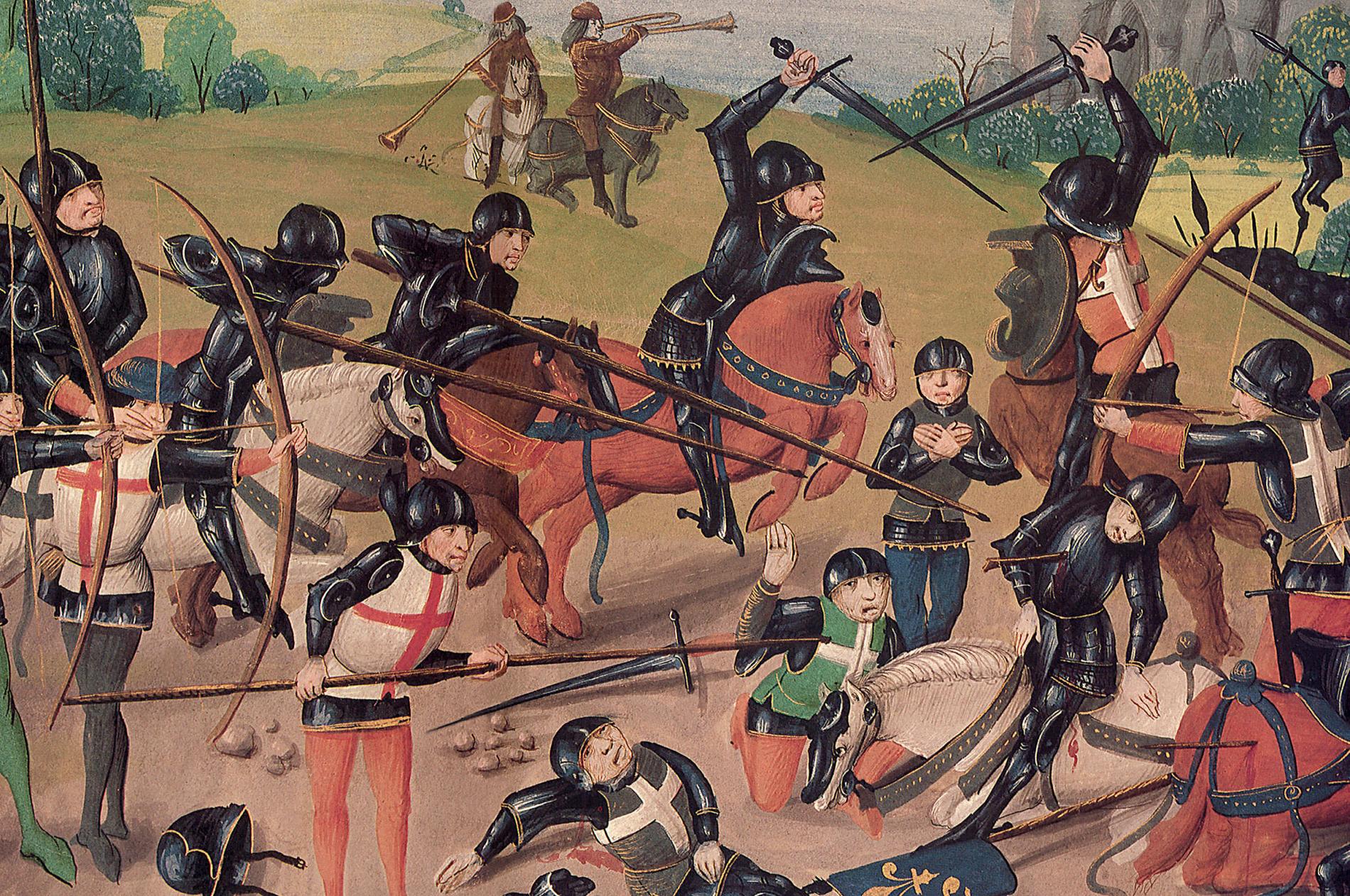 Bretaņā 1351. gadā tika sarīkota «Trīsdesmit vīru cīņa» - divu armiju bruņinieku sacensības uz dzīvību un nāvi «par savu dāmu mīlestību», katrai pusei deleģējot 30 cīnītājus. Franču pils garnizons izaicināja pretiniekus uz cīņu, apsūdzot viņus laupīšanā un pamiera noteikumu pārkāpšanā. Angļi un viņu sabiedrotie vācieši zaudēja deviņus, uzvarējušie franči - sešus vīrus. Sagūstītos dzīvos pretiniekus viņi atbrīvoja pret simbolisku izpirkumu. Aplenkto piļu vai pilsētu aizstāvji padodoties cerēja uz uzvarētāju žēlastību. Taču 1370. gadā Limožas bīskaps zaudēja savas ilūzijas par Edvardu Melno princi, jo Anglijas karaļa Edvarda III dēls, iekarojis pilsētu, pavēlēja nogalināt visus sagūstītos. Dažreiz vienkārši saujiņa bruņinieku nespēja savaldīt padoto asinskāri (par labu nenāca apžēlošana, ko Simtgadu karā saņēma noziedznieki, piekrītot cīnīties Francijā), taču komandieriem bija tiesības ļaundarus pakārt.