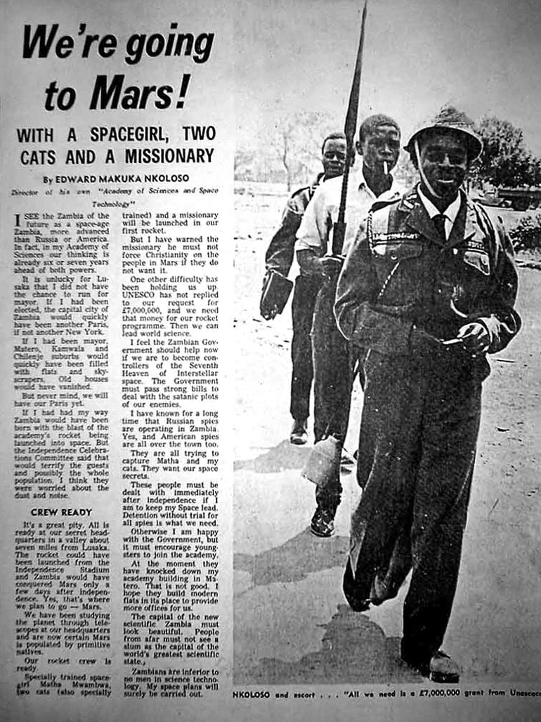 Stāsts par Zambijas kosmosa programmu izklausās pēc anekdotes vai slikti safabricētas viltus ziņas, taču tā ir balta patiesība. Zambijas kosmosa apguves plāni patiešām pastāvēja, tos centās īstenot konkrēti cilvēki, un par tiem pavisam nopietni ziņoja pasaules mediji. Tiesa, varam tikai iztēloties, kā reportieri valdīja smieklus, uzklausot zambiešu fantastiskos plānus. Bet varbūt arī nesmējās - galu galā, tas taču bija Āfrikas lielo cerību laiks, kad šķita, ka koloniālisma jūgu nokratījušajām jaunajām valstīm nav nekā neiespējama.