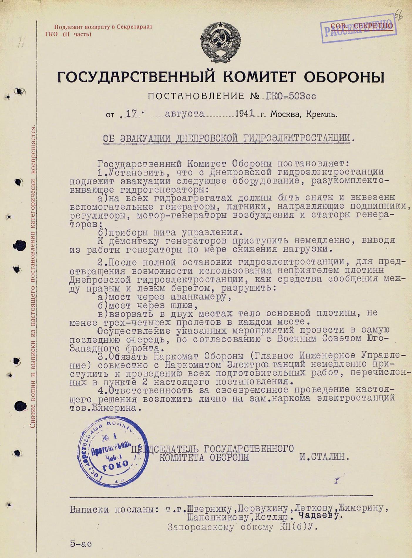 17. augustā Valsts aizsardzības komiteja pieņēma pilnīgi slepenu lēmumu par Dņipras HES evakuāciju. Tajā ne tikai uzskaitīti evakuācijas pasākumi, bet arī norādīts, ka nepieciešams iznīcināt rietumu krasta priekštiltu, tiltu pāri slūžām austrumu pusē, kā arī divās vietās saspridzināt dambi, vismaz trīs vai četrus laidumus katrā no šīm vietām. Spridzināšanas mērķis - nepieļaut, lai ienaidnieks dambi izmantotu kā ceļu, pa kuru no rietumu krasta var nonākt austrumu krastā. Rīkojumu parakstījis komitejas vadītājs Staļins.