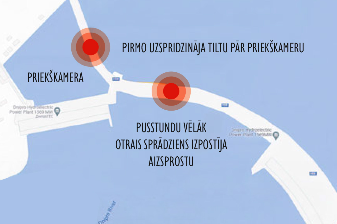 Pavisam bija divi sprādzieni. Pirmais uzlaida gaisā rietumu krasta priekštiltu, bet otrais, kas norībēja pusstundu vēlāk, izpostīja pašu dambi.