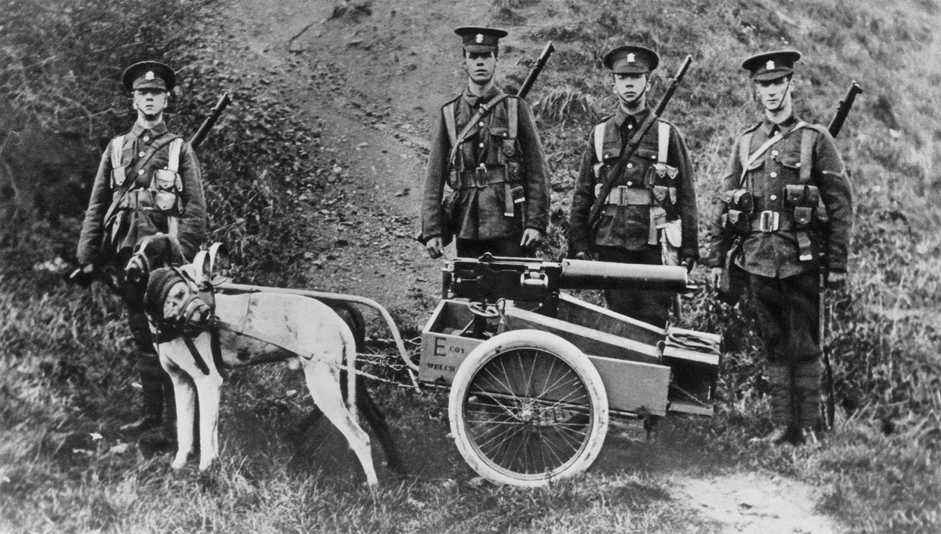 Jau no laika gala cilvēki karā ir iesaistījuši dzīvniekus - pietiek atcerēties kaut vai Maķedonijas Aleksandra kavalēriju un Hanibāla kaujas ziloņus. Kavalērijas loma būtiski sāka mazināties Pirmā pasaules kara laikā, taču pavisam no kaujaslaukiem zirgi nepazuda vēl ilgi, jo kā vilcējtransportu tos plaši izmantoja arī nākamajā lielajā karā. Diezgan bieži karā nācies doties arī cilvēka labākajam draugam sunim, un šajā ziņā nekas daudz nav mainījies arī mūsdienās, kad dienesta suņus izmanto sprāgstvielu meklēšanā. Bet Pirmā pasaules kara laikā, kā liecina šis foto, britu karavīri suņus izmantoja arī kā vilcējus - iejūdza ratos ar ložmetēju.