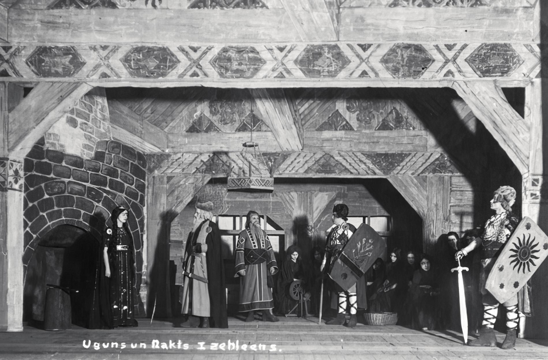 «Senlatvijas» vizuālo tēlu veidoja arī Lāčplēša eposa, bet vēlāk Raiņa lugas Uguns un nakts uzvedumu dekorācijas. To galvenā sastāvdaļa bija grandiozas koka guļbūvju konstrukcijas, tautiskie ornamenti kokgriezumos. Arheoloģija vēl bija pašos sākumos, tāpēc koka piļu zīmējumiem, metiem un dekorācijām nebija nekāda zinātniska pamatojuma. Tomēr tie izveidoja ļoti noturīgu stereotipu par to, kā izskatījušās senlatviešu pilis pilskalnos un ozolu svētbirzis līdzās tiem.