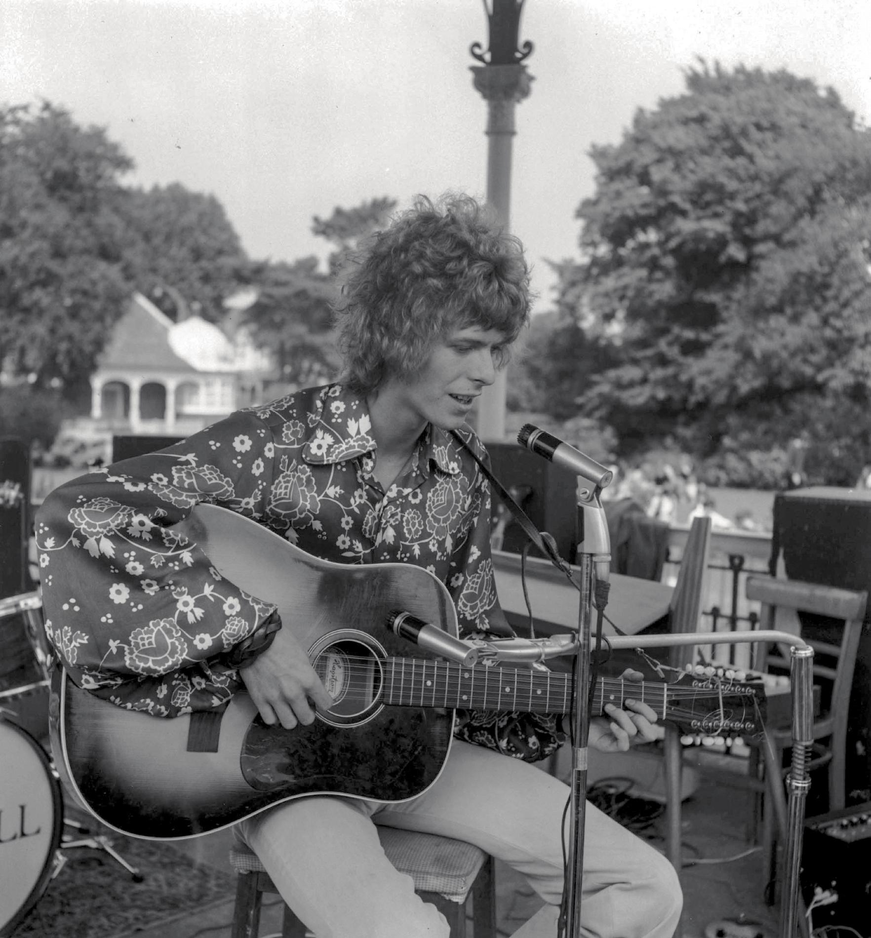1967.gadā Bovijs izdeva soloalbumu ar jokainām pašsacerētām dziesmiņām Viktorijas laika mūzikhola stilā un pievienojās slavenā mīma Linzija Kempa trupai. Sekoja psihedēliska folkroka albums. Rokoperu, kuras darbība risinās ballītē pirms galvenā varoņa pašnāvības, neviens neņēma nopietni, tādēļ tā palika autora galvā un piezīmēs. Toties 1969. gadā viņš sacerēja Space Oddity- psihedēlisku viena solista piecminūšu minioperu, kas atbalsoja laikmeta aizrautību ar kosmosa apgūšanu; Bovijs neslēpa, ka viņu ietekmējusi Stenlija Kubrika filma 2001: Kosmosa odiseja, turklāt Space Oddity singls par dažām dienām apsteidza cilvēka pirmos soļus uz Mēness (dziesma skanēja arī BBC reportāžā par šo notikumu). Mūsdienās tā ir folklora, toreiz uz brīdi kļuva par hitu, bet kopumā tika vērtēta kā prasta iedzīvošanās uz tematikas aktualitātes rēķina. 1970. gadā viņš ietērpās kleitā un izdeva roka albumu The Man Who Sold the World. Tā tituldziesma jau 30 gadus daudziem ir pazīstama kā Kurta Kobeina un Nirvana hits, bet īstenībā ir viens no pirmajiem klasiskajiem Bovija sacerējumiem, kurš savā laikā palika nesadzirdēts.