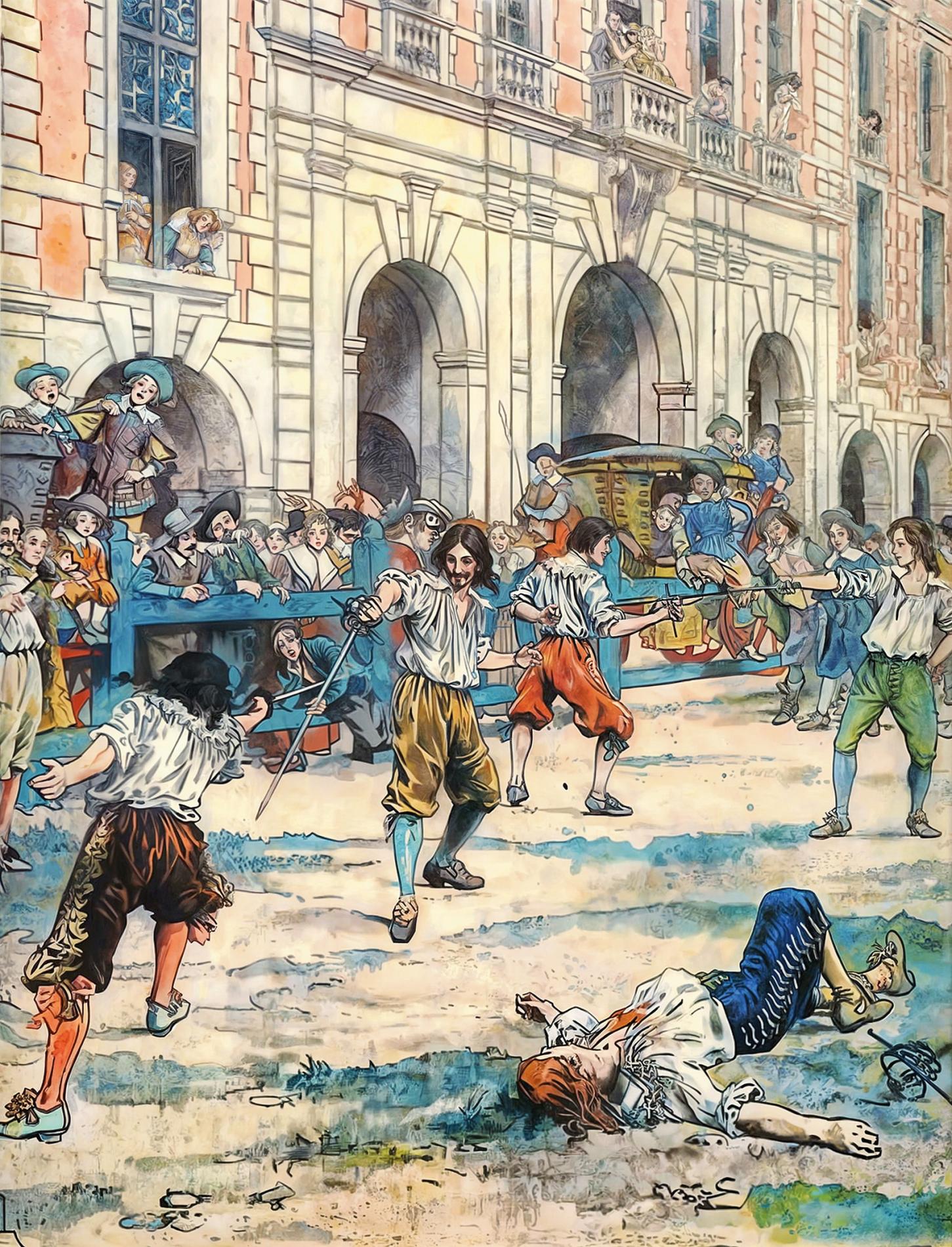 Stāsts par grāfa de Butvila un marķīza de Bevrona dueli visā krāšņumā ataino tā laika franču muižnieku domāšanu. Bevrons turēja ļaunu prātu uz Butvilu par to, ka tas bija divkaujā nogalinājis viņa draugu, taču attiecības ar zobeniem rokās abiem traucēja nokārtot apstāklis, ka Butvils dzīvoja emigrācijā Briselē, uz kurieni viņam bija nācies steigšus bēgt, kad karalis pavēlēja grāfu arestēt par kārtējo dueli. Kad Bevrons uzzināja, kur apmeties viņa ienaidnieks, tad devās pa tā pēdām uz Briseli, taču turienes varasiestādes, padzirdējušas par briestošo dueli, abus arestēja un atbrīvoja tikai tad, kad viņi zvērēja te nekādus kautiņus nerīkot. Ņemot vērā, ka Luijs XIII bija aizliedzis Butvilam atgriezties Francijā, tas dusmās paziņoja, ka, par spīti karalim, sarīkos divkauju ar Bevronu pašā Parīzes centrā, Karaļa laukumā. Tā bija liela nekaunība: apmēram kā tagad sarīkot apšaudi Rīgas Doma laukumā, cerot, ka neviens to nepamanīs. Turklāt vēl tieši blakus Karaļa laukumam dzīvoja kardināls Rišeljē.