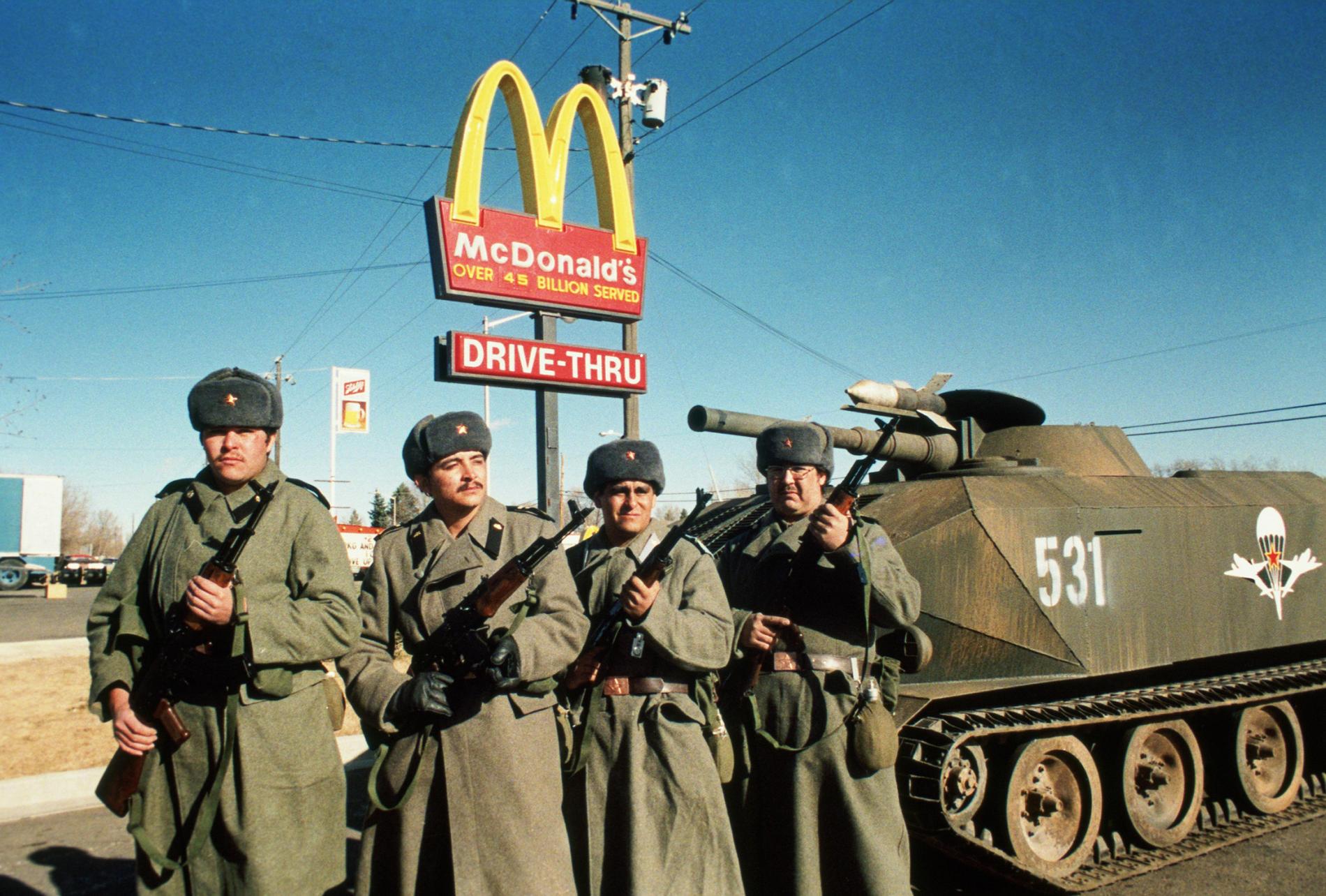 Tomēr viena no aizkustinošākajām bija 1984. gada filma Sarkanā rītausma, kas vēsta par PSRS, Kubas un Nikaragvas armiju iebrukumu Savienotajās Valstīs. Jā, Amerika tiek pārsteigta nesagatavota un okupēta, pa Detroitas un Aspenas ielām braukā padomju bruņutransportieri, Vašingtona un Ņujorka ir nopostītas kodolsprādzienos, taču vienkāršie amerikāņu patrioti nepadodas. Bariņš jauniešu Kolorādo štatā izveido partizānu vienību un uzbrūk padomju armijas bāzēm un karaspēka kolonnām. Pusaudžus var saprast, jo invāzijas pirmajās minūtēs krievu desantnieki ir nošāvuši viņu mīlēto un cienīto vēstures skolotāju - skaidrs, ka okupanti nevar atstāt dzīvu cilvēku, kurš jaunatni audzinājis patriotisma garā. Cīņa ir ilga un asiņaina, taču visi tic, ka uzvarēs demokrātija!