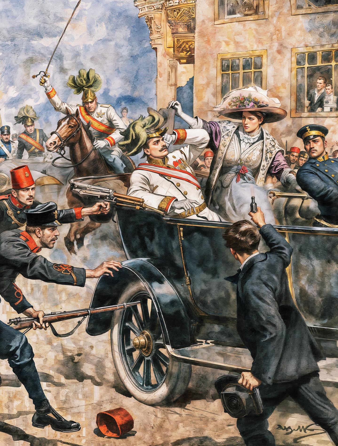 Dažu dienu laikā visiem agrākajiem sasniegumiem tika pārvilkta svītra, uzsākot tik asiņainu karu, kāds vēl nebija pieredzēts. Kādēļ? Kam tas bija vajadzīgs? Formāli viss sākās ar Austroungārijas troņmantnieka erchercoga Franča Ferdinanda slepkavību Sarajevā, pie kuras lielā mērā bija vainīga Serbija, taču nelaimīgais atentāts bija tikai kara iegansts, nevis cēlonis. Arī pirms tam bija nošautas, nodurtas un noindētas neskaitāmas karaliskas izcelsmes personas, taču to dēļ kari nez kādēļ neizcēlās. Tādēļ pamēģināsim izsekot notikumu ķēdītei, kas noveda līdz Pirmā pasaules kara pirmajām zalvēm.