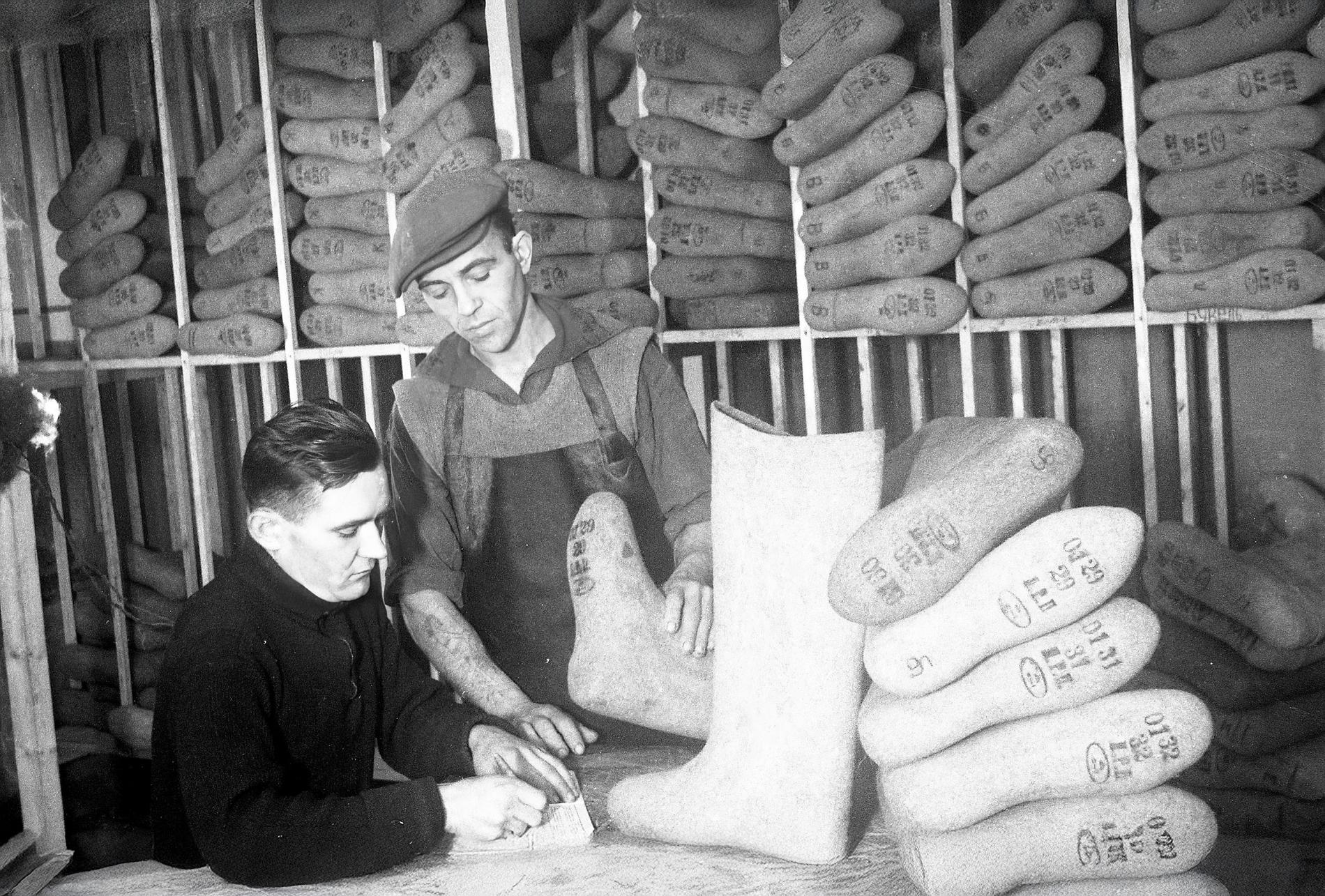 Laikos, kad ziemas bija bargas un sniegiem pārbagātas, laukos cilvēkiem lieti noderēja apavi, kuru dzimtene ir Krievija. Tur tos sauc par vaļenkiem, bet latviešu valodā - par velteņiem. Nosaukums diezgan precīzi atspoguļo šo apavu izgatavošanas tehnoloģiju: aitas vilna tiek plucināta, presēta un savelta, līdz veido vienāda biezuma masu, no kuras tad ar īpašas formas palīdzību veido zābakus. Šādi apavi ir lieliski piemēroti ziemai ar sausu sniegu, jo labi pasargā kājas no aukstuma. Mitrākiem apstākļiem izgatavoja velteņus ar gumijas galošām, kas aizturēja slapjumu. Velteņus ražoja arī Latvijā - šis attēls uzņemts Ludzas rūpkombināta velteņu cehā, kur priekšnieks no brigādes vadītāja pieņem gatavo produkciju.