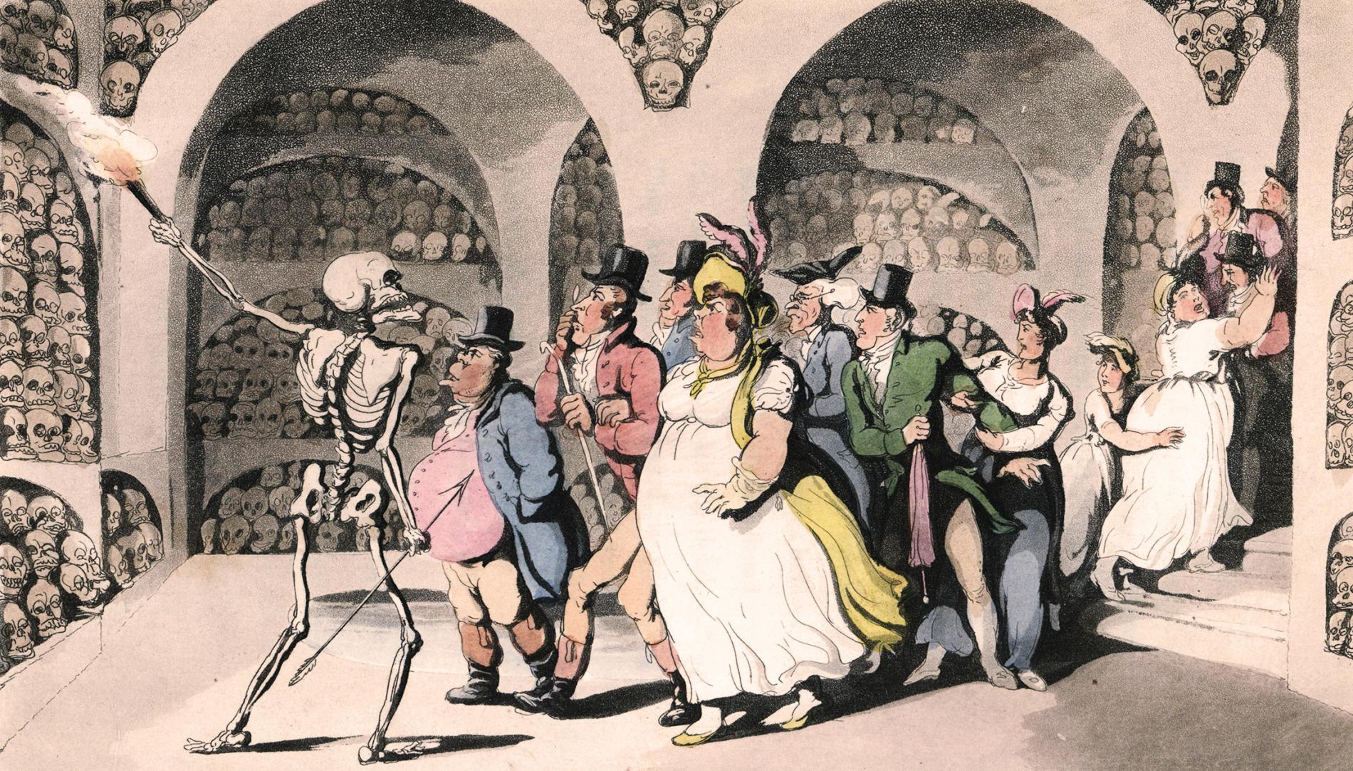 Pazemē dusošo ļaužu kompānija ir visai raiba. Vienā lielā brāļu kapu masīvā kaulu pie kaula guļ mantīgie un nemantīgie - gan augstmaņi, gan ubagi, gan nezināmi pilsoņi, gan slavenības. Te sev mieru ir raduši rakstnieki Šarls Perro un Fransuā Rablē, matemātiķis Paskāls un ķīmiķis Lavuazjē, dramaturgi Moljērs un Rasins, fabulu virtuozs Lafontēns un filozofs Monteskjē. Bet franču revolūcijas nesamierināmais un kaismīgais orators Marats atdusas līdzās savai slepkavai Šarlotei Kordē. Laiku pa laikam starp kaulu grēdām trāpās arī skulptūras, urnas un zārki, kā arī pazīstamu celtņu (un ne tikai Francijas) maketi. Tā viens no XVIII gadsimtā pazemē strādājošajiem ar palamu Bosežūrs (Jauks atvaļinājums - fr. val.) vienā no nišām izbūvēja Baleāru salu ostas Maonas maketu - tur, sabijis angļu gūstā, viņš pavadīja vairākus neaizmirstamus mēnešus. Tiesa, gandrīz tūlīt pēc sava šedevra pabeigšanas viņu apēda nogruvums un katakombu annālēs ierakstīja vēl vienu piederīgo.