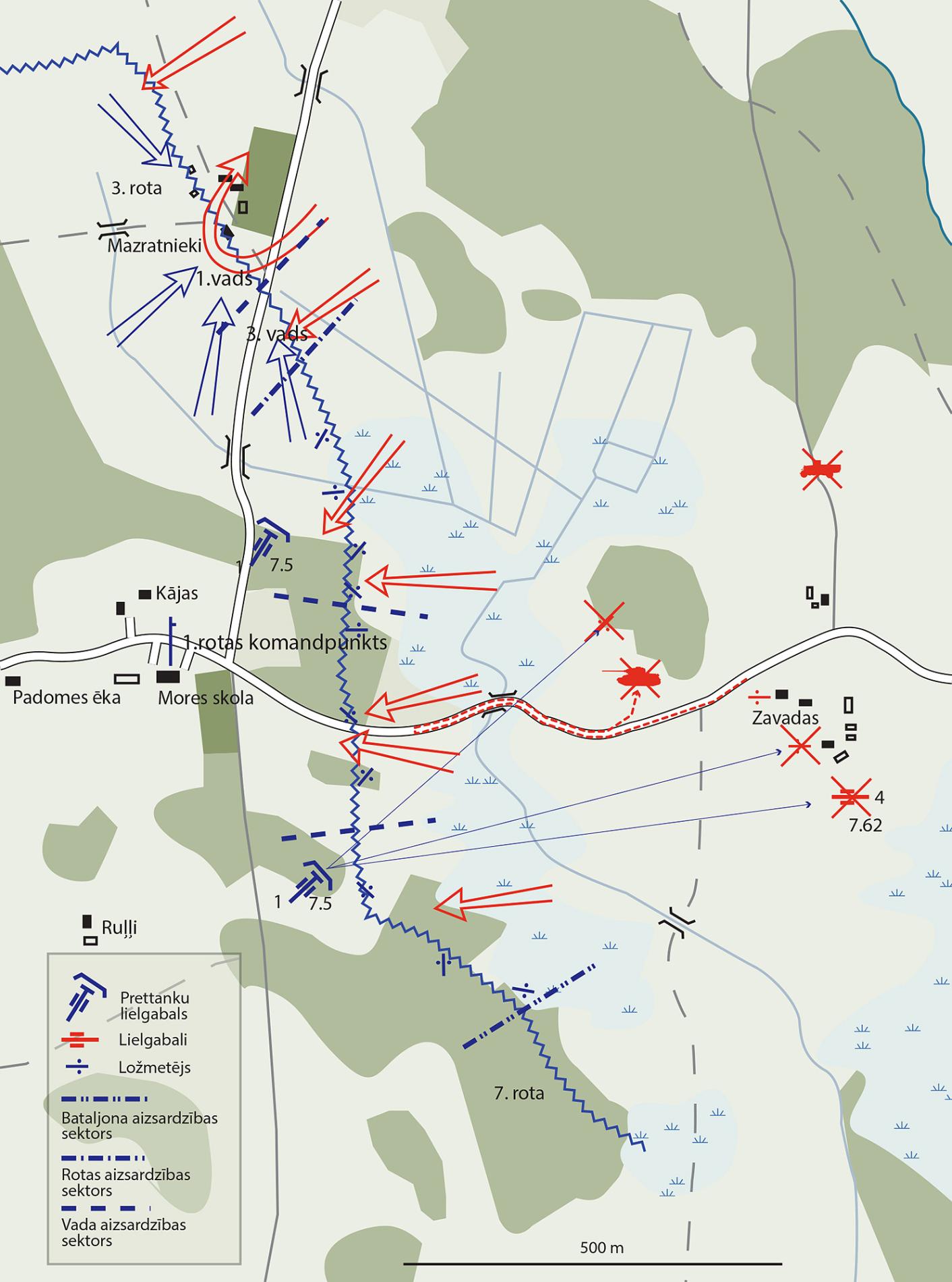 Kauju smaguma punkti bija Zavadas un Mores skola, kur aizsargājās leitnanta Kovtuņenko 44. grenadieru pulka 1. rota. Šeit uzbruka trīs bataljoni no padomju 89. strēlnieku pulka, bet neguva būtiskus panākums.
