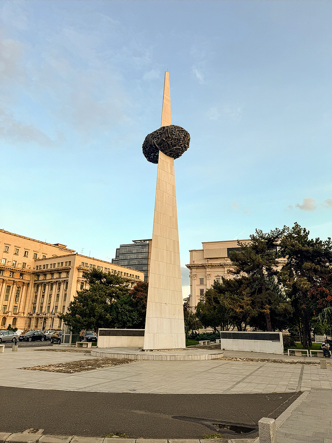 Revolūcijas laukumā, iepretim vecajai Centrālkomitejas ēkai, ir izbūvēts piemiņas memoriāls 1989. gada protestos bojāgājušajiem. 25 metrus augstajam marmora obeliskam apkārt izveidots metāla vainags, kas simbolizē jaunas Rumānijas atdzimšanu pēc komunisma sabrukuma.
