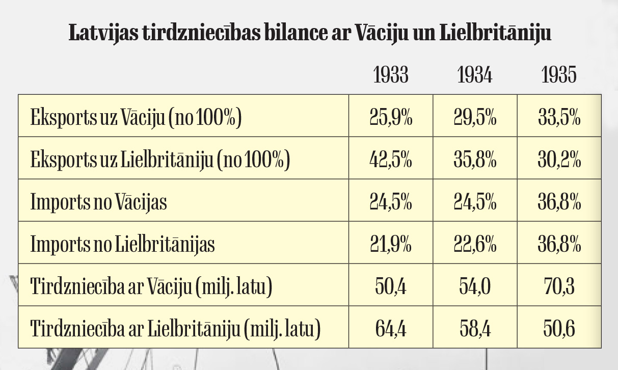 Sākotnēji mūsu valsts ārējā tirdzniecībā - gan preču eksportā, gan importā - dominēja briti. Vēlāk, jau trīsdesmito gadu vidū, pirmo vijoli pārņēma vācieši. Sava tiesa «nopelnu», iespējams, bija tam, ka Lielbritānija grūti atguvās no 1929. gada pasaules saimnieciskās krīzes un 1931. gadā tādēļ atteicās no zelta seguma savai sterliņu mārciņai.