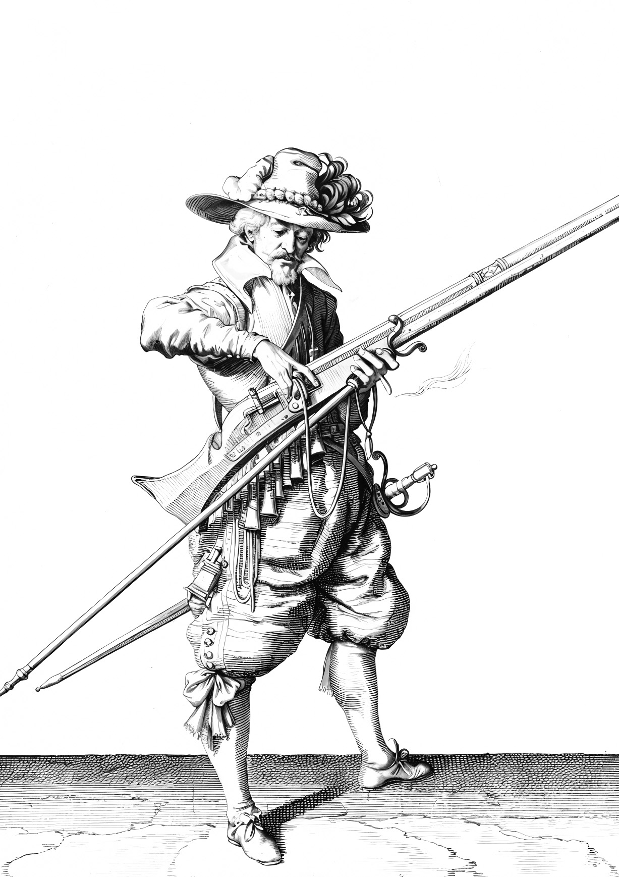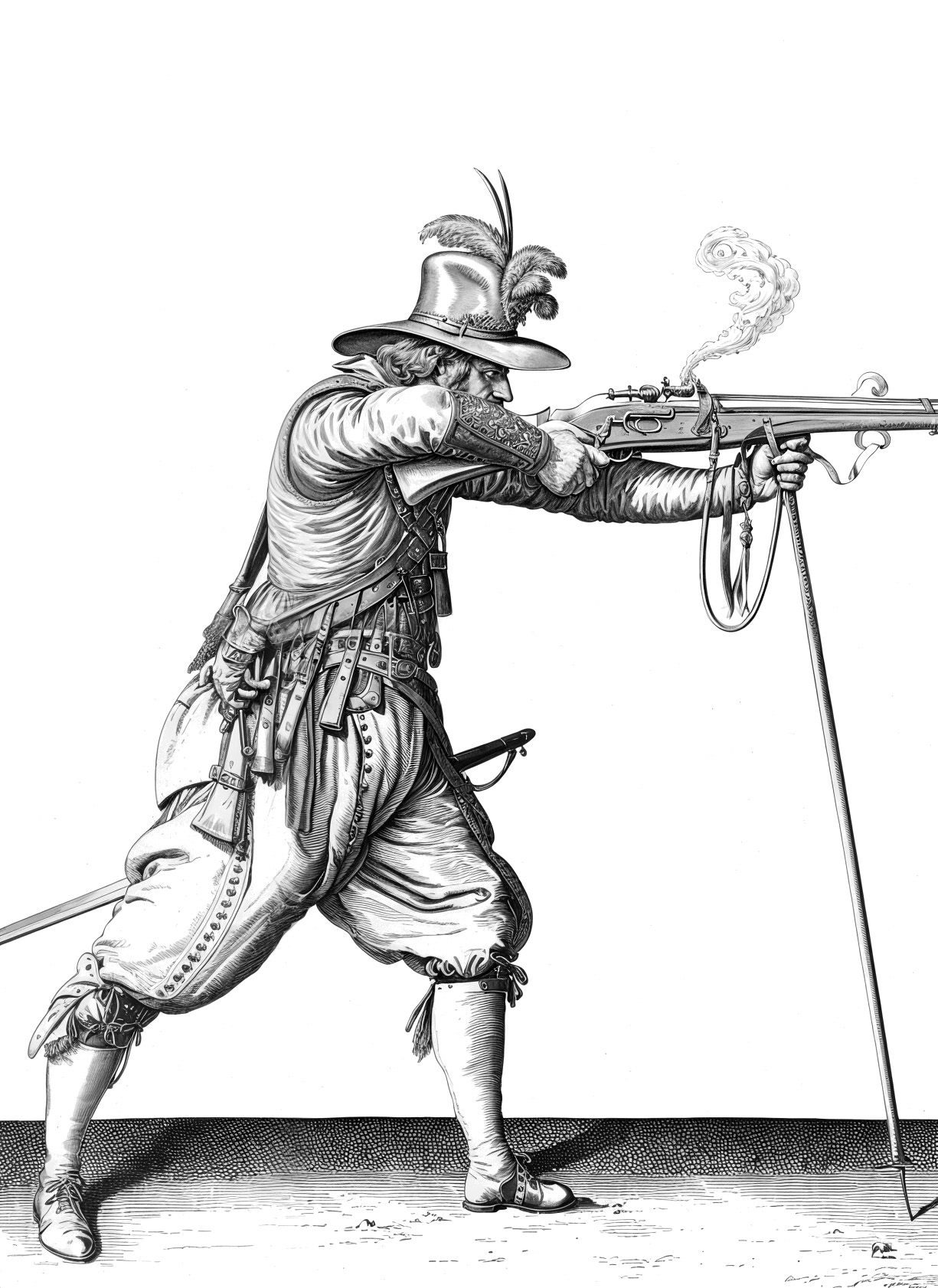 Patiesībā musketes pielādēšana bija visai piņķerīga padarīšana. Muskete kreisajā rokā, ar labo roku stobrā tiek iebērts pulveris, kas jāpiespiež ar speciālu slauķi, tālāk seko lode, parķis, kurš atkal tiek notrombēts ar slauķi, pie stobra pamatnes jāievieto deglis un tad pielādētā šautene jānovieto uz furketes jeb balsta dakšas. Ja Dimā būtu aprakstījis šīs musketieru dienesta ikdienas ainas, viņa romāns būtu izstiepies uz tūkstoš lapām un nez vai kļūtu tik populārs. Viņa izklāstā viss bija vienkārši un bezgala aizraujoši: šaušana, traktieris, kautiņš, špagas, zirgi, skuķi un nežēlīgs dzertiņš - vai te maz atliek laiks normālam dienestam galmā?