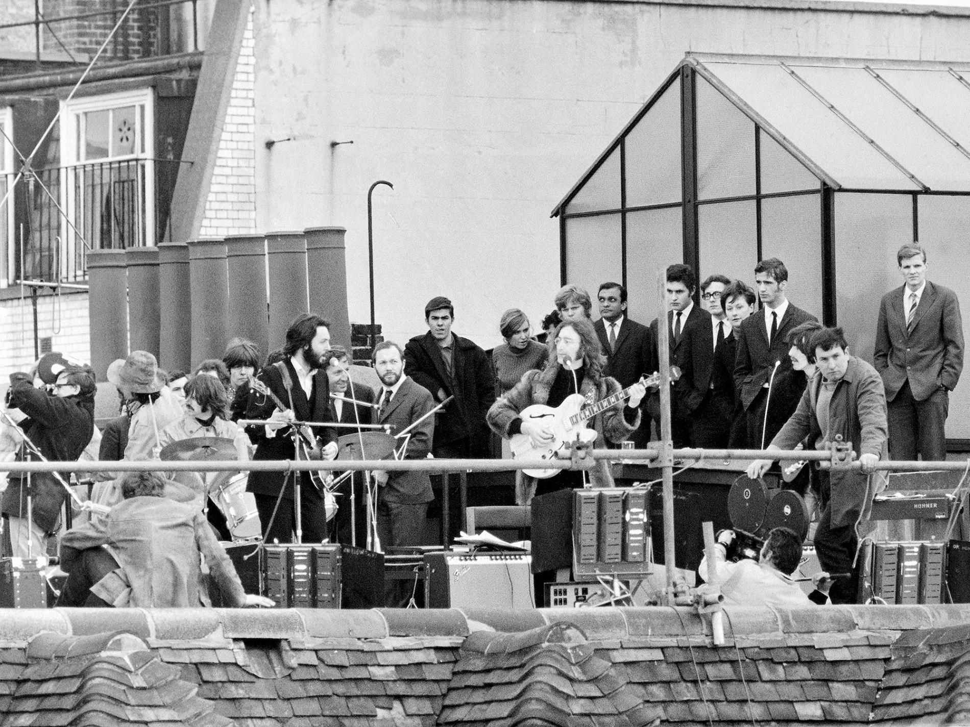 Neilgi pēc vieniem, beidzot iznākot uz jumta, Džonam mugurā bija Joko kažokādas jaka, Džordžam melns puskažoks, bet Ringo kā koši sarkana boja mirdzēja savas kundzes Morīnas jaunajā lietusmētelī. Pols, kuru vairāk nekā visus pārējos sildīja notikuma grandiozitātes apziņa, bija tērpies vien melnā uzvalkā un gaišā kreklā ar atpogātu apkaklīti. Bez viņiem, kinogrupas un tehniskā personāla uz jumta bija pārdesmit tuvāko līdzgaitnieku. Ārpus Apple ēkas par šo ieceri pagaidām nezināja gandrīz neviens.