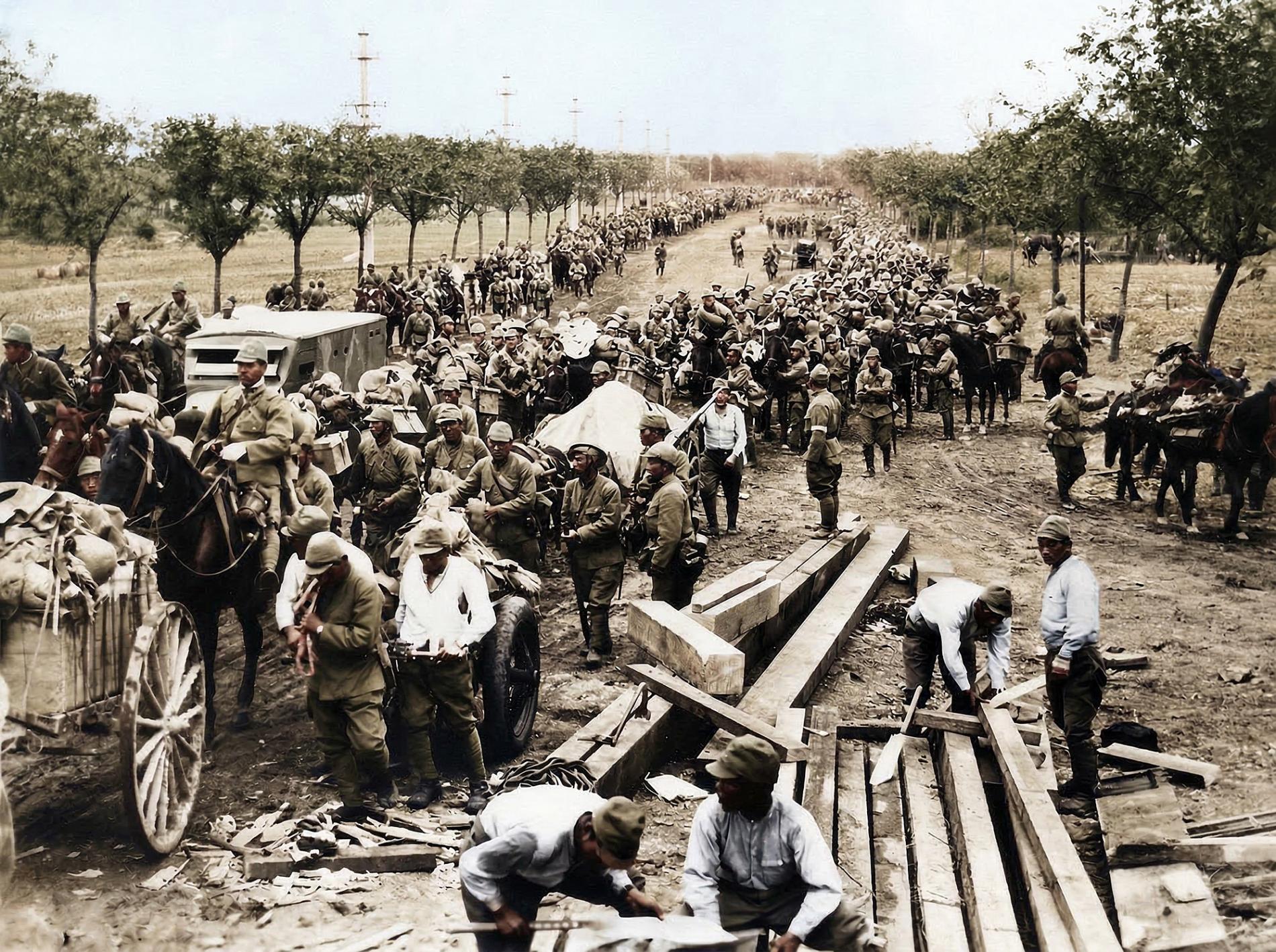 Japānas Impērija jau agrāk (1931-1932) bija sagrābusi Ķīnas ziemeļaustrumus - Mandžūriju - un tur savas ekspansijas piesegam izveidoja marionešu valsti, tronī sēdinot 1911. gada revolūcijā gāztās Ķīnas imperatoru dinastijas pārstāvi. Tokija 1937. gada jūlijā pieteica karu Ķīnas Republikai, un mēneša beigās iekarotāji ieņēma galvaspilsētu Pekinu. Augusta vidū sākās cīņa par Šanhaju, un ķīnieši bez aviācijas un pat artilērijas atbalsta spēja pilsētu noturēt trīs mēnešus. Kaujās liela daļa metropoles tika pārvērsta drupās, savukārt ĶRA kaujasspējīgākās divīzijas zaudēja pat trīs piektdaļas karavīru. Lai izbēgtu no draudošā aplenkuma, ķīniešiem nācās pamest pozīcijas Šanhajas centrā.
