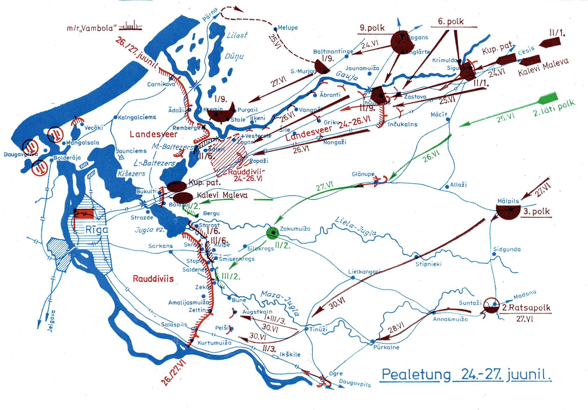 30. jūnijā un 1. jūlijā situācija landesvēram un Dzelzsdivīzijai kļuva pavisam kritiska, atkāpties nācās praktiski visā frontes līnijā. Igauņu 9. pulkam, 6. pulkam un Kuperjanova bataljonam izdevās šķērsot Gauju. Vakarā 9. pulks ieņēma Jaunciemu un Kalngali un izgāja jau pie Ķīšezera krasta. 6. pulks un Kuperjanova bataljons ieņēma Sužus.
